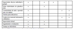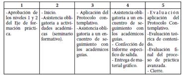 El aspecto post-secular de la propuesta del Eje de formación práctica tiene su cúlmine en el nivel avanzado y la participación en un seminario de formación especifico en el enfoque contemplativo. Esta actividad académica es realizada en tres sesiones de 90 minutos, junto a dos sesiones de seguimiento, en las cuales los estudiantes son introducidos a la base teórica y didáctica del Modelo Cuadrivial y otros aspectos relevantes del enfoque contemplativo y la educación emocional. Es importante destacar que además de las actividades académicas señaladas en la Tabla 2, los estudiantes tienen la oportunidad de compartir y nutrirse de las experiencias con exalumnas de la carrera que han participado del seminario en años anteriores. Una vez los estudiantes son capacitados mediante las actividades mencionadas en la Tabla 2, se prosigue el periodo de práctica profesional en el cual los estudiantes durante 3 meses realizan en forma permanente una práctica contemplativa por ellos previamente diseñada. Al finalizar esta preparación, las supervisoras toman la responsabilidad de seguimiento y evaluación de las planificaciones respectivas, así como velar por la calidad en su conducción.