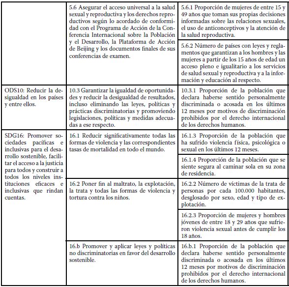 Dicha propuesta se construye en torno a 17 objetivos programáticos de diversos ámbitos (ONU, 2015), de los cuales cinco tienen relación directa con el desarrollo de programas y planes de educación sexual. El primero en el eje de Salud y Bienestar, el cual busca frenar el avance de los índices de ITS y garantizar el acceso universal a servicios de atención y educa- ción en sexualidad. En segundo lugar, el objetivo orientado a la Educación de Calidad, desde donde se plantean como metas brindar acceso a una educación pertinente y eficaz, involu- crando la sexualidad, así como también disminuir brechas de género. En tercer término, se encuentra el objetivo que aboga por la Equidad de Género, centrándose en poner fin a las discriminaciones arbitrarias y toda forma de violencia hacia mujeres y niñas, así como tam- bién brindar acceso a la educación y servicios de anticoncepción y salud sexual. Finalmente, en cuarto y quinto lugar, se encuentran el objetivo que de Reducción de Desigualdades y el de Paz, Justicia e Instituciones Solidarias, ambos focalizados en brindar oportunidades y erradicar brechas de desarrollo para cada país. Cada uno de estos objetivos se organiza en torno al establecimiento de metas e indicadores de verificación de su avance (Tabla 1), que son dispuestos para sean los Estados quien desarrollen sus propios mecanismos de monito- reo y reporten voluntariamente sus resultados para la elaboración de informes regionales e internacionales (ONU, 2017).
