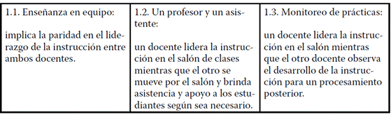 En cuanto a los 6 modelos de co-docencia, si bien los modelos de agrupación como enseñanza alternativa, paralela o en estaciones pueden observarse, son fruto de una colaboración trabajada (Hurd y Weilbacher, 2017). Ello se puede atribuir a la complejidad de estas opciones y la preparación de los docentes para aplicarlas (Keeley, 2022). Esto hace que la enseñanza en equipo, el monitoreo de prácticas y el de un profesor y un asistente sean más comunes, predominando significativamente el de un profesor y un asistente (Brendle et al., 2017; Iacono et al., 2021; Scruggs et al., 2007). Definimos brevemente estos tres modelos de co-docencia: