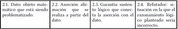 La estructura argumentativa se compone de dato, aserción, garantía, calificar modal, respaldo y refutación (Toulmin, 2003). Sin embargo, siguiendo a Pedemonte (2007), consideramos que cualquier correlación entre un argumento y una prueba es una justificación relevante, por tanto, consideramos suficiente dato, aserción, garantía y refutador (Solar y Deulofeu, 2016) (ver tabla 2).