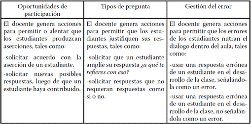 En la búsqueda de este escenario previo, destacamos las habilidades comunicativas (Lee, 2009), cuyo valor ya ha sido reportado (Solar, 2018). Entre otras aristas, las estrategias plantean que las preguntas realizadas a los estudiantes requieran respuestas más allá de afirmaciones o negaciones simples; que los errores de los estudiantes sean empleados sistemáticamente para estimular el diálogo; que la participación de los estudiantes sea constantemente requerida. Los tipos de preguntas son cruciales para la aparición del refutador (Cervantes Barraza et al., 2019), y con las debidas cautelas (Dewsbury y Brame, 2019) las oportunidades de participación motivan y desafían a los estudiantes (Meece et al., 2006), el correcto uso de los errores es una eficiente garantía de ambientes seguros de validación y de espacios dialógicos (Díez-Palomar, 2017), necesario para que los estudiantes ofrezcan diferentes aserciones y una eventual argumentación colectiva (Solar y Deulofeu, 2016).