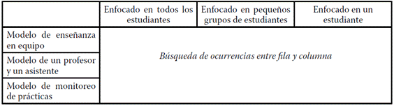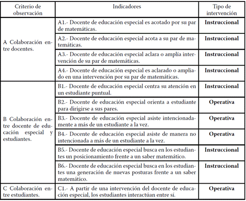 El segmento del instrumento enfocado en las formas de colaboración durante co-docencia, determinó sus criterios de observación a partir de categorías elaboradas por Buli-Holmberg y Jeyaprathaban (2016). Los indicadores se extrajeron mediante la técnica de flip-flop a partir de observación de casos. Los tipos de intervención se establecieron a partir del trabajo de Rasmitadila et al. (2020).