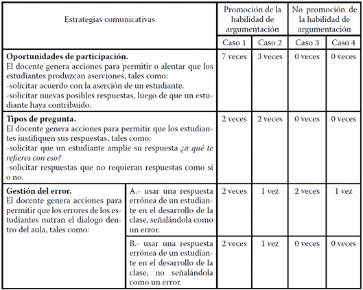 Al aplicar el instrumento sobre promoción de la argumentación descrito en la tabla 3 en los 26 casos disponibles, discriminamos 20 casos sin evidencia significativa sobre promoción de la habilidad de argumentación (2 o menos estrategias comunicativas empleadas). Desde los restantes 6 casos donde si hubo promoción de la argumentación, 4 de ellos tuvieron algunos rasgos de evidencia significativa (las 3 estrategias comunicativas empleadas, pero solo una vez) y 2 casos que tuvieron evidencia significativa (las 3 estrategias comunicativas empleadas más de una vez). Seleccionamos estos últimos 2 casos para el estudio. Dado que los 20 casos sin evidencia significativa de promoción de argumentación presentaron una saturación de códigos (Vasilachis, 2006) seleccionamos 2 de ellos de manera aleatoria para realizar el contraste.