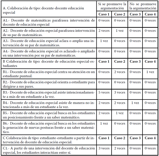 Establecido lo anterior, y a partir de la evidencia aportada (véase tabla 7), a nivel docente-docente, observamos que el docente de educación especial no es complementado ni sus intervenciones enriquecidas por su par de matemáticas. Sin embargo, al ser promovida la argumentación, el docente de educación especial sí que realiza estas acciones hacia su par de matemáticas, lo que indica un mayor rol en la gestión de saberes específicos de la materia (Rasmitadila et al., 2020), aunque esto ocurre en raras oportunidades.