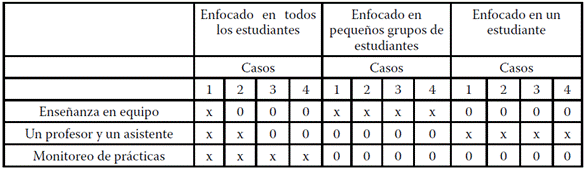 Considerando que los casos 1 y 2 presentaron evidencia de promoción de la habilidad de argumentación, y los casos 3 y 4 presentaron evidencia de no promocionarla, en la tabla 8 se puede observar que: cuando el trabajo se realiza con un solo estudiante, el modelo de colaboración, sin excepción es de un profesor y un asistente. Cuando el trabajo en aula se enfocó en pequeños grupos de estudiantes solamente hubo evidencia del modelo de trabajo en equipo. Donde se expresó heterogeneidad fue cuando el trabajo de aula se enfocó en todos los estudiantes. El modelo de colaboración de un profesor y un asistente se evidenció en todos los casos, sin embargo, el modelo de un profesor y un asistente solo encontró evidencia cuando la habilidad de argu-mentación fue promovida. La enseñanza en equipo fue un modelo de colaboración que solo ocurrió una vez en un caso, por lo que no establecimos generalizaciones a partir de ella.