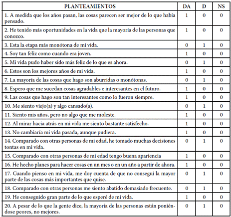Se utilizó la escala de Satisfacción con la Vida LSI-A (ver anexo 1) desarrollada por Neugarten, Havighurst y Tobin en la década de los 60. Esta es una medida operacional válida y confiable del bienestar psicológico entre las personas mayores. Considerando cinco factores en el análisis de contenido que son: Congruencia entre objetivos deseados y alcanzados, representado por 7 ítems; Entusiasmo, evaluado a través de 4 ítems; Tono emocional, también con 4 ítems; Autoconcepto, incorporado en 3 ítems; y finalmente, Resolución y Fortaleza, considerando 2 ítems. Es una escala breve, de fácil administración que consta de 20 ítems que se responden con los indicadores "De acuerdo"/ "En desacuerdo" / "Dudoso”.