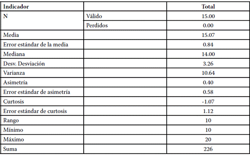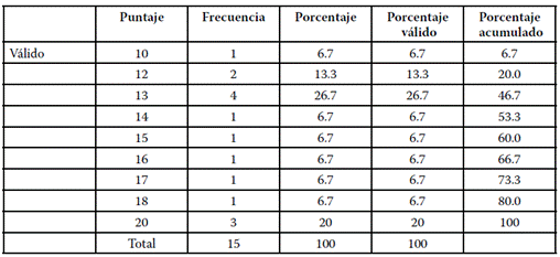 Dado el poder estadístico de la muestra el estudio piloto, se analizó la distribución de los datos. Los datos mostraron tener una distribución dispersa sobre la media con una curtosis de -1.074. En cuanto a la distribución de asimetría sobre la media (.402) indica un sesgo hacia la izquierda. La media del Índice de Satisfacción con la Vida (LSI-A) para el total de la muestra fue 15.07 puntos con una desviación estándar de 3.26 y la mediana de 14.00 (véase Tabla 1). La varianza fue 10.63, considerando un puntaje máximo de 20 puntos (indicando un alto nivel de Satisfacción con la Vida) que fue logrado por 3 personas y el puntaje mínimo logrado que fue de 10 puntos (1 usuario). La moda fue 13 puntos, evidenciada en 4 usuarios (véase Tabla 2).