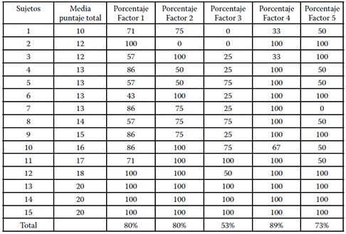 En el factor 4 se logró el 89% del puntaje total de la media de los ítems que le corresponden (ítems 3, 7, 10 y 18). Interesantemente, 12 de los sujetos lograron el 100% del puntaje total de este factor, pero dos sujetos mostraron un bajo autoconcepto, logrando solo 33% del puntaje, indicando una variabilidad de estos dos sujetos que afectó al rendimiento del grupo.
