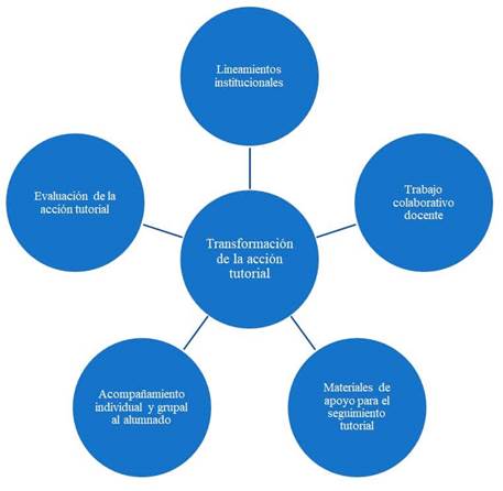En función de las ideas anteriormente expuestas puede afirmarse que la transformación de la práctica tutorial se dio de manera emergente y abarcó los aspectos que pueden visualizarse en la figura 1 y que se describen a continuación, cuyo objetivo central fue dar continuidad al acompañamiento del estudiantado de modo planificado y pertinente, incidiendo en los factores de riesgo que surgieron durante el confinamiento y las primeras etapas del regreso a la presencialidad, considerando las características de la nueva normalidad.