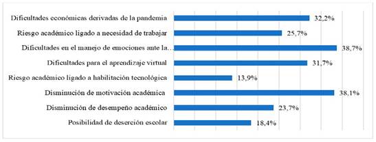 Como puede observarse en la figura, las dificultades ligadas al manejo de emociones ante la pandemia fueron las más relevantes, ya que el 38.7% de los estudiantes señaló que esta fue una de las temáticas que se abordaron en sus sesiones de tutoría. Asimismo, la disminución de la motivación académica del alumnado resaltó entre los resultados, puesto que el 38.1% de los estudiantes refirió que en las tutorías se trabajó con esta necesidad.