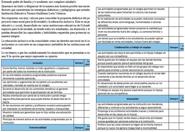 Como lo afirma McMillan y Schumacher (2005), “las encuestas se emplean para conocer las actitudes, las creencias, los valores, las características demográficas, los comportamientos, las opiniones, los hábitos, los deseos y las ideas de las personas” (p. 292), lo cual responde a la intención de los investigadores quienes formularon las afirmaciones para conocer la perspectiva que tenían los padres de familia frente al proceso educativo inclusivo, así como sus opiniones respecto a las acciones escolares que desarrolla la institución para la formación integral. Este instrumento (Figura 1) fue validado por un experto y posteriormente aplicado.