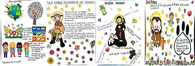En el quinto momento se llevó a cabo una actividad de conversación con los estudiantes sobre la fiesta alusiva a San Roque y sus tradiciones. Los estudiantes expresaron sus opiniones y gustos sobre la fiesta y se proyectaron videos relacionados con la vida de San Roque y el respeto a la diversidad de culto. Los estudiantes participaron de manera activa y receptiva, realizando una actividad final de creación de posters sobre la fiesta patronal y quienes profesaban otro culto un póster donde pudiesen compartir sus creencias, como se muestra en la Figura 10.