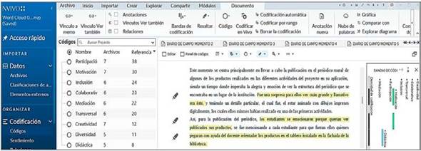 En el marco de esta investigación, se llevó a cabo un proceso de codificación y análisis de los registros recopilados, que incluyeron diarios de campo y entrevistas con docentes. Para llevar a cabo este proceso, se utilizó la herramienta de análisis cualitativo NVivo 14, que permitió identificar y categorizar los elementos más representativos que se visualizaron durante la intervención del proyecto. La Figura 13, que se presenta a continuación, destaca los hallazgos más relevantes en orden de importancia: participación, motivación, inclusión, colaboración, mediación, transversalidad, creatividad, diversidad y didáctica.