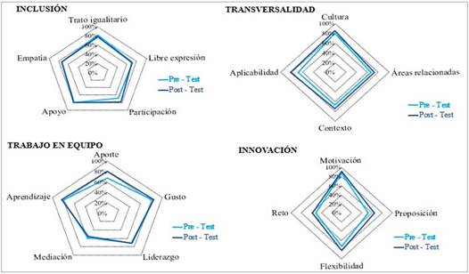 Para los estudiantes, los constructos que previo a la implementación del proyecto mostraban mayores oportunidades de mejora eran la transversalidad y la innovación. Los aspectos que tienen mayor incidencia en la baja calificación del constructo de transversalidad son la realización de actividades con poca relación entre los saberes de las diferentes áreas de aprendizaje, sin tener presente la realidad que viven los estudiantes y con abordaje de temas que no se pueden aplicar con facilidad en su contexto. Con respecto al constructo de innovación, se evidenció una preferencia hacia lo conocido e inseguridad por lo nuevo, adicional a un temor por proponer actividades diferentes en el desarrollo de las clases.