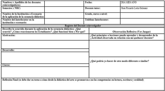 Este instrumento (Figura 3) permitió registrar de manera sistemática las observaciones realizadas durante la inmersión en el campo y la ejecución de las acciones planeadas, fue diseñado por la institución universitaria a la que pertenecen los investigadores.