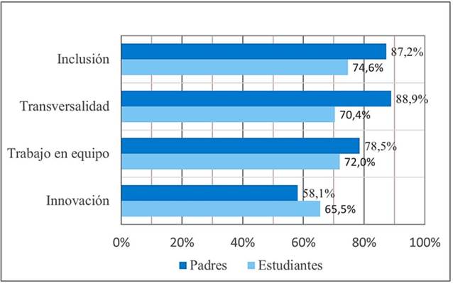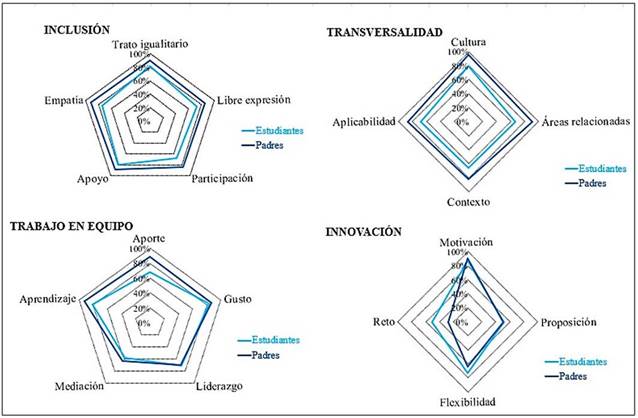 La percepción de los encuestados se esquematizó utilizando una escala de valores que oscila desde el 100%, para representar la observación constante de las ideas relacionadas con cada uno de los ejes, hasta el 0%, que indica que dichas ideas nunca se han evidenciado. El resultado de esta fase se presenta en la Figura 4, que ofrece una representación gráfica de la percepción de los padres de familia y estudiantes.