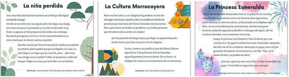 En el segundo momento, se utilizó la lectura de cuentos tradicionales, la proyección de videos históricos propios de la región y la temática de indagación científica para incentivar de manera colaborativa la creación cuentos cortos, lo cual fomentó el trabajo en equipo, la creatividad y el liderazgo. Se destaca el potencial del periódico escolar como estrategia didáctica integral y transversal, que aborda competencias no solo académicas, sino también socioafectivas. Si bien, un grupo reducido de estudiantes no mostraba al inicio agrado a la creación de ideas que llevaran a la construcción del cuento, la escucha de ideas por parte del colectivo motivo a que todo el grupo terminara participando y presentando desde sus capacidades individuales una creación colaborativa. La Figura 7, muestra algunos cuentos creados y publicados en el periódico mural.