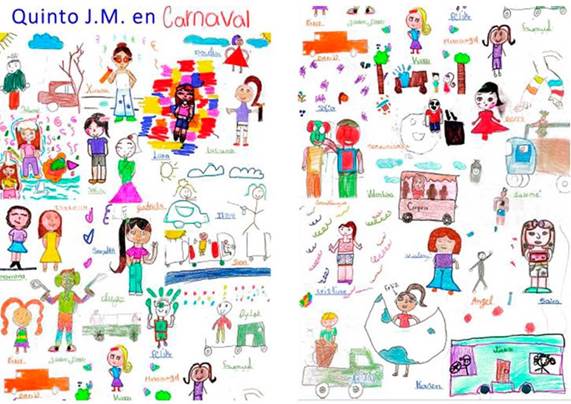 El tercer momento se utilizó para trabajar el tema de las emociones y el Carnaval como tradición cultural. Los estudiantes participaron activamente, compartieron sus experiencias personales y reflexionaron sobre sus emociones. Se realizaron actividades como el dibujo del pájaro del alma y el autorretrato relacionado con el Carnaval, los cuales fueron agrupados, como se observa en la Figura 8, y publicados en el periódico mural. Los resultados fueron muy positivos, ya que todos los estudiantes se mostraron comprometidos y participativos, expresando de manera gráfica y sin exclusión su imagen del Carnaval.