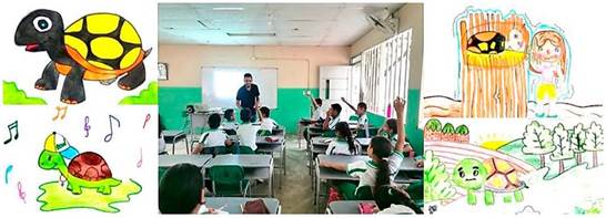 Para el cuarto momento, los estudiantes participaron en la temática del morrocoy, una especie endémica de la región que se encuentra en peligro de extinción, y generaron ideas para protegerlo. La temática utilizada generó gran motivación, ayudó a ampliar el conocimiento sobre la especie y despertó la creatividad con enfoque de sostenibilidad ambiental. Se les pidió a los estudiantes realizar un producto creativo que incluyera acciones para proteger al morrocoy; en la Figura 9, se muestran algunas de las creaciones publicadas en el periódico.