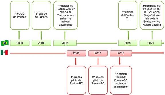 Como resultado, se observa una proximidad al comparar las fechas de implementación de Paebes y Exeims-BC, ya que ambos siguen el modelo de políticas nacionales de evaluación. Paebes se asemeja al Enem y Exeims-BC establece similitudes con la Evaluación Nacional del Logro Académico en Centros Escolares (Enlace), creada en 2006.