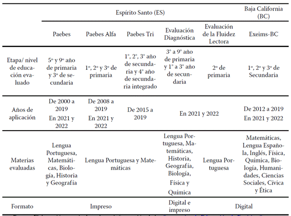 Respecto al Exeims-BC, se observan, con base en la Tabla 3, características similares a la Evaluación Diagnóstica en cuanto a: a) el nivel educativo evaluado (con un enfoque mayor en educación secundaria); b) un conjunto más amplio de materias evaluadas; y c) el formato de las pruebas (digital). En general, es posible comprender que las evaluaciones en Espírito Santo son más integrales y diversificadas en cuanto a las etapas/niveles de enseñanza y las materias evaluadas. Además, los formatos son variados en comparación con el Exeims-BC de Baja California (COBACHBC, 2020).