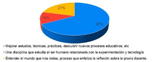 Ante la pregunta ¿Cuál es la finalidad de investigar en Educación? El 67% del grupo participante responde que es mejorar estudios, técnicas, prácticas educacionales por medio de la realidad observada. A su vez, se indica que es un modo de descubrir nuevos procesos educativos, aportando con posibles soluciones o mejoras al mismo sistema educacional en base a datos empíricos que produzcan nuevos conocimientos transformadores de la realidad. Por otra parte, el 12% estima que la finalidad de la investigación educativa es establecer una disciplina para estudiar al ser humano, por medio de la experimentación y tecnología. Finalmente, el 21% señala que es una forma de entender el mundo que nos rodea a través de un proceso donde se enfatiza la reflexión sobre la praxis docente.