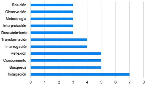 El uso de vocabulario es fundamental para llevar adelante un trabajo de investigación. Por tal motivo, en este estudio se le pregunta a cada docente participante con qué palabras asocian un trabajo investigativo. Las respuestas más frecuentes son: “Indagación”, seguido de “Búsqueda”, “Conocimiento” y “Reflexión”, tal como lo indica la Figura N°2.