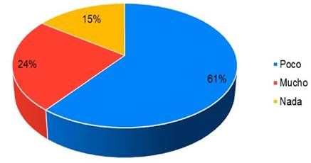 Respecto a la pregunta que indaga sobre si el profesorado puedo o no realizar investigación, el 61% responde que escasamente puede hacerla en su lugar de trabajo; sin embargo, el 24% manifiesta que sí puede realizar investigación dentro de su jornada laboral. Se añade a lo anterior un 15% que declara que no realiza nada de investigación.