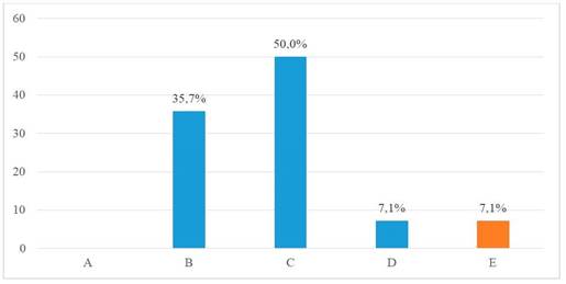 Por último, en la pregunta 4 solo tres concepciones se presentan entre los participantes. Aquellas no elegidas corresponden a una hora (A) y una semana (C) de duración de la traslación alrededor de la Tierra. Y de las elegidas, la más reiterada con un 50,0% es la idea de que este movimiento dura un día (B), seguido de un 35,7% que responde de manera correcta que tiene una duración de un mes (D) y solo un 7,1% cree que la duración es de un año (E).