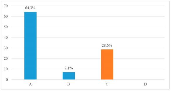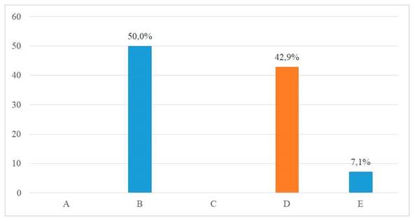 En el caso de la segunda pregunta, no hay estudiantes que respondan Luna creciente (D). Solo se obtienen respuestas entre las tres alternativas restantes. De estas, un 28,6% de los estudiantes responden de forma correcta que los eclipses solares se producen cuando hay luna nueva (C), mientras que un 64,3% responde Luna llena (A) y únicamente un 7,1% responde Luna menguante (B).