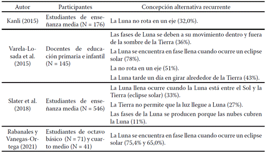 Volviendo a las concepciones alternativas, existen diversos estudios centrados en la astronomía, orientados fundamentalmente hacia eventos astronómicos que se podrían categorizar como familiares, es decir, que comúnmente se presentan en el currículum educativo, tales como la forma de la Tierra y la gravedad, los movimientos de la Tierra (asociado a la sucesión del día, de la noche y de las estaciones), las fases de la Luna y los eclipses con sus efectos de sombras. A partir de estos estudios, se extrae que uno de los temas con mayor presencia de concepciones alternativas se refiere a las fases de la Luna (ver Tabla 1).