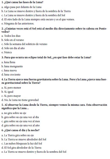 De estas preguntas, 4 están asociadas a conocimientos de la Luna y sus fases; y son las que serán utilizadas en este trabajo de investigación. El cuestionario fue adaptado para ser rellenado por medio de la plataforma de Google Forms y se realizó un piloto con 9 estudiantes para verificar la comprensión, sentido de los planteamientos y manejo del software. A partir de esta observación, no se requirió ninguna modificación.