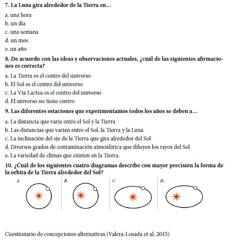 Para determinar la presencia de concepciones alternativas y el posterior cambio conceptual en los estudiantes, se utilizó el cuestionario diseñado por Valera-Losada et al. (2015) (Ver Anexo 1), el cual fue desarrollado a partir de una revisión bibliográfica de estudios abocados a las concepciones alternativas en astronomía. Está compuesto por un total de 10 preguntas de selección múltiple, donde cada alternativa corresponde a preconcepciones recurrentes en estudiantes escolares, universitarios, docentes e incluso en adultos.