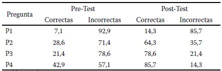 Posterior a la implementación de la actividad, se evaluó nuevamente a los participantes para identificar cambios en las concepciones alternativas respecto al diagnóstico. Con ello se obtiene un cuadro comparativo entre las respuestas obtenidas el pre-test y post-test (ver Tabla 3).