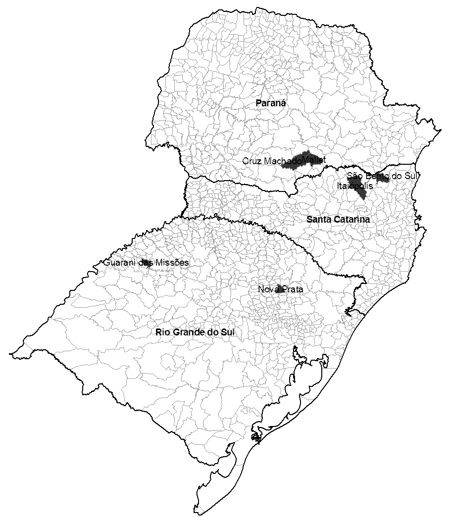 A pesquisa desenvolvida possui natureza qualitativa e a coleta de dados formou uma consistente base documental (Creswell, 2010), que oportunizou a utilização da análise de discurso associada à análise de conteúdo. A abrangência da pesquisa, como demonstrado na Figura 1 é constituída pelas seguintes cidades: Cruz Machado e Mallet, no Paraná; Itaiópolis e São Bento do Sul, em Santa Catarina; Nova Prata e Guarani das Missões, no Rio Grande do Sul.