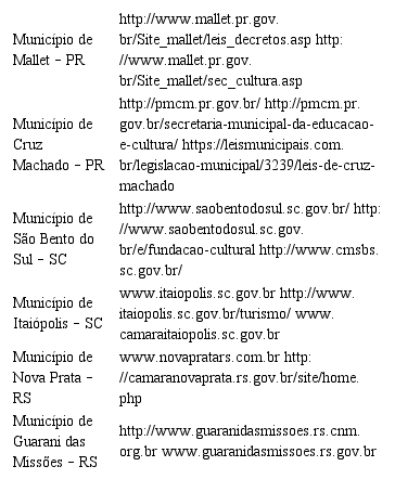 Expressando as dinâmicas social, políticas e cultural das cidades indicadas na Figura 1, as informações e hyperlinks constantes no Quadro 1 foram retiradas dos portais oficias das prefeituras, câmaras municipais e fundações de cultura dos governos municipais e formaram o corpus de análise do presente estudo. O foco desta busca foi identificar elementos representativos da contribuição da etnia polonesa para a formação e a dinâmica das cidades.
