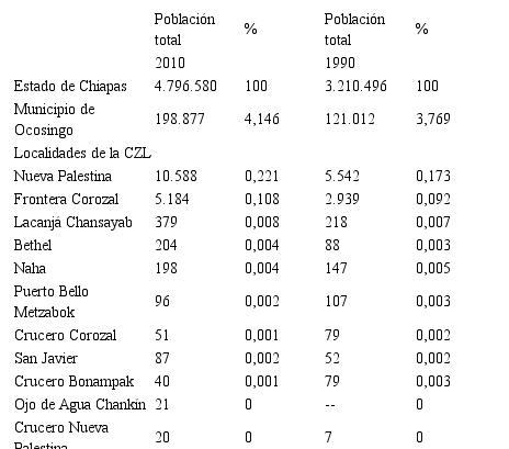 La CZL es una comunidad agraria e indígena, creada por la reforma agraria mexicana[2]. Tiene 16.794 habitantes (Tabla 1). La CZL alberga en su territorio dos localidades urbanas (Nueva Palestina y Frontera Corozal)[3] y diez rurales[4] (Tabla 1)[5], así como también siete áreas naturales protegidas (Figura 1 y Tabla 2).