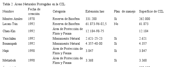 Las Áreas Naturales Protegidas (ANP) son el principal instrumento de conservación. México es un actor internacional relevante en materia de conservación de la biodiversidad: tiene registradas cuarenta y dos reservas de la biosfera (hasta enero de 2017) en la Red Mundial de Reservas de Biosfera de UNESCO. En este contexto, la importancia de la CZL viene dada porque su territorio alberga diversas áreas protegidas (Tabla 3). Finalmente, se da una relación dual con los gobiernos: de cooperación; pero también de conflictos sobre temas de tenencia de la tierra y acceso, uso, manejo de los recursos naturales (Calleros Rodriguez, 2014).