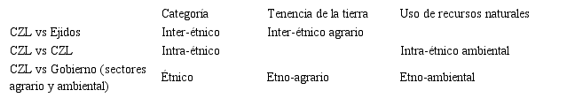 Los años setenta marcan el inicio de la configuración de la SL como la conocemos hoy. Anteriormente era una zona virgen habitada por los lacandones (De Vos, 2003) y bajo explotación forestal (González Pacheco, 1983) se convirtió en una región de pobladores agrarios y, casi simultáneamente, una zona de conservación ambiental. Desde su creación en 1972, si se clasifican los conflictos en los que la CZL es partícipe, con otros actores agrarios (ejidos) y con los gobiernos, podemos establecer una clasificación (Cuadro A). En efecto, el conflicto que involucra a la CZL tiene tres dimensiones: con comunidades (ejidos) adyacentes, también indígenas (inter-étnico); conflictos dentro de la propia CZL (intra-étnico); y conflictos de la CZL con las autoridades (federales, principalmente) (étnico). Los conflictos y las tensiones que se han desatado han sucedido principalmente por dos temas: por la tenencia de la tierra (agrario); y por la utilización de la naturaleza (ambiental). Estas dimensiones resultan en la clasificación propuesta.