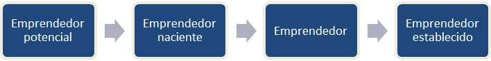 El proceso es concebido en cuatro etapas y tres transformaciones. La primera etapa es la concepción del emprendedor potencial, búsqueda de oportunidades, ideas, etc. La segunda etapa es la del emprendedor naciente con un negocio en formación, para convertirse en gestor de su nuevo negocio. La última etapa consolida la figura del emprendedor establecido (ver: Figura 1).