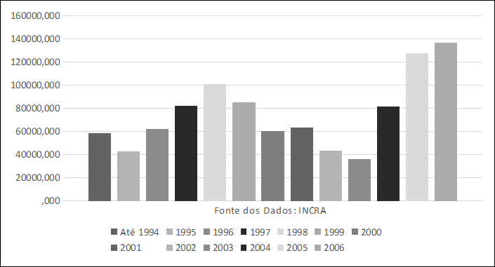 A principal política pública territorial para o campo brasileiro é a política de reforma agrária que encontra diversas barreiras no Brasil, no entanto, com a redemocratização brasileira o debate acerca dessa política ressurgiu, é por meio do processo de assentamentos regularizados pelo INCRA, a partir de 1995, que a reforma agrária se efetiva. Podemos analisar no gráfico 01 o número de assentamentos no período até 2006 (Figura 1).