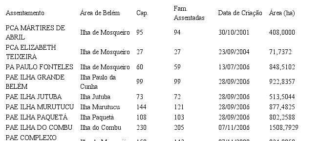 É durante o período de férias que os investimentos em saúde e segurança são implementados em mosqueiro, com o foco de atrai os “veranistas” para as praias do distrito, movimentando a economia da Ilha e possibilitando a parte dos assentados a buscar alternativas para aumentar sua renda por meio do trabalho assalariado ou alternativo. A população residente da Ilha de Mosqueiro mais do que duplicou em 40 anos, indo de 14.460 mil habitantes em 1980 a 33.232 mil habitantes em 2010, a estimativa é de 50 mil habitantes atualmente (IBGE). O crescimento populacional da ilha ocorre devido ao processo de abertura da rodovia Meira Filho em 1965 e se intensifica com a construção da Ponte Sebastião de Oliveira em 1976, de acordo com Ferreira (2012) nos últimos 30 anos mosqueiro se reconfigura, e as moradias temporárias passam a ser moradias fixas, além de aumentar a presença de assentamentos e ocupações nas áreas da ilha. Belém possui cerca de dez assentamentos rurais, dentre eles, temos dois PCA (Projeto de Assentamento Casulo), um PA (Projeto de Assentamento Federal) e sete PAE (Projeto de Assentamento Agroextrativista), como podemos perceber na Tabela 1.
