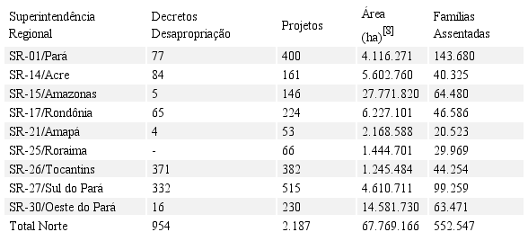 Como abordado anteriormente, o governo federal por meio do Instituto Nacional de Colonização e Reforma Agrária (INCRA) se responsabiliza pela titulação da terra, e a prefeitura municipal, no caso de Belém por intermédio da CODEM, teria como papel o aparato de maquinário e de técnicos para auxiliar nos assentamentos, com isso, os projetos buscavam a implementação da reforma agrária na região por meio de desapropriações e regulamentação de assentamentos. De acordo com dados levantados pela coordenação do INCRA, até 2018 foram desapropriados 954 imóveis somente na região Norte[7] (Tabela 2).