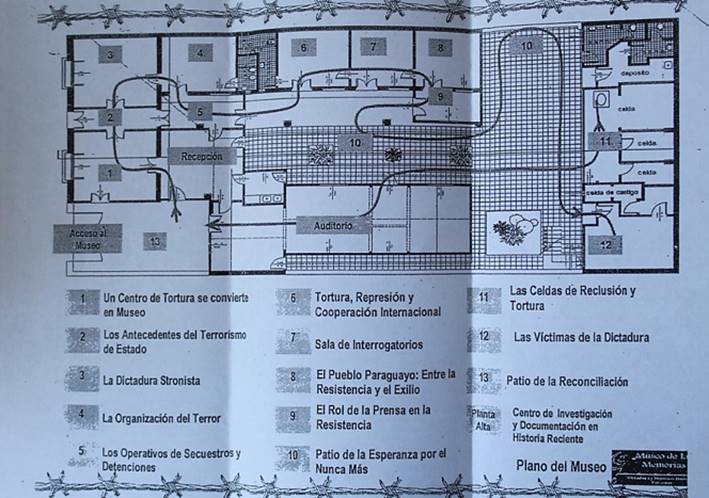 Com base nos critérios museológicos e arquivísticos do NS-Dok, portanto, o espaço do Museu fora dividido, no novo projeto, de acordo com um sistema “didático e lógico”, conformando uma exposição permanente. Esta explicaria, cronologicamente, o surgimento da ditadura stronista, o personalismo de Stroessner, a organização da repressão em espaços nacionais e internacionais e as estratégias de enfrentamentos, resistências e exílios.