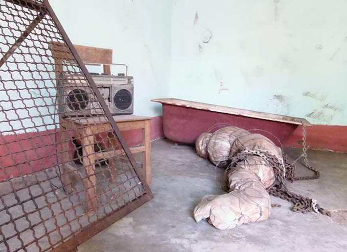 Neste mesmo pátio, encontram-se as celas, onde se mantinham os presos, esperando por seus “interrogatórios”. Com a finalidade de demonstrar a violência propagada naquele espaço, decidiu-se pela reconstrução das celas, realizada com a pesquisa em material audiovisual gravado no momento de encerramento da ex-La Técnica, e com os objetos trazidos de outras instituições policiais. Assim, a representação se tornou explícita, relacionada ao cotidiano da prisão e às práticas de tortura, tornando-a o ápice das exposições, tal como realizado com as celas do museu alemão (Figura 5).
