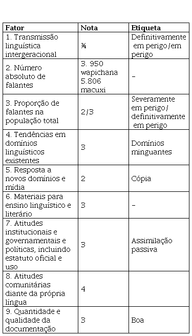 Não existe ainda um levantamento dos usos e da vitalidade das línguas indígenas de Roraima. Os trabalhos que se preocupam com o tema são esparsos em teses e dissertações em diferentes campos do saber. Como já mencionado, das línguas originárias de Roraima, apenas o macuxi e wapixana recebem uma maior atenção por parte dos estudiosos residentes em Boa Vista. O trabalho de Elango et al. (2020) é a pesquisa mais recente sobre a vitalidade das duas línguas indígenas em questão, além do inglês na fronteira com a Guiana. As autoras, baseadas nos instrumentos de avaliação de vitalidade de línguas da UNESCO (2003), elaboraram a seguinte tabela (Tabela 1) para a vitalidade das línguas de seu estudo: