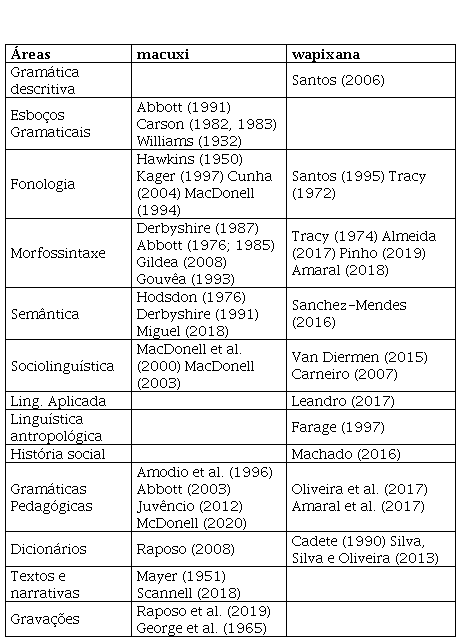 O que se percebe com a tentativa de aferir a saúde documental e descritiva das línguas minoritárias e em perigo de extinção é o risco de tomar parâmetros avaliativos que não atentem para a real qualidade dos produtos decorrentes dos esforços de documentação e descrição. Veja-se o exemplo das línguas macuxi e wapixana. Elango et al. (2020, p. 137) enumeram uma lista não exaustiva de trabalhos sobre as duas línguas abarcando as principais áreas dos estudos gramaticais como fonologia, morfossintaxe, semântica, sociolinguística, etc. (Quadro 1).