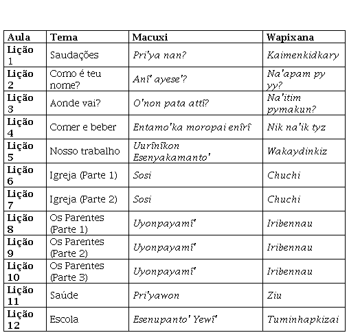 A estrutura dos dois cursos segue o modelo de cursos de línguas em que são privilegiadas as situações de comunicação entre falantes. As temáticas são as comumente encontradas em cursos de línguas, iniciando com “saudações” até situações interacionais mais complexas, como em rituais e relações familiares e sociais. Para se ter uma ideia da organização das lições, abaixo são apresentados no quadro 2 as 12 primeiras lições de macuxi e wapixana, já que até a lição 12 os programas compartilhavam das mesmas temáticas: