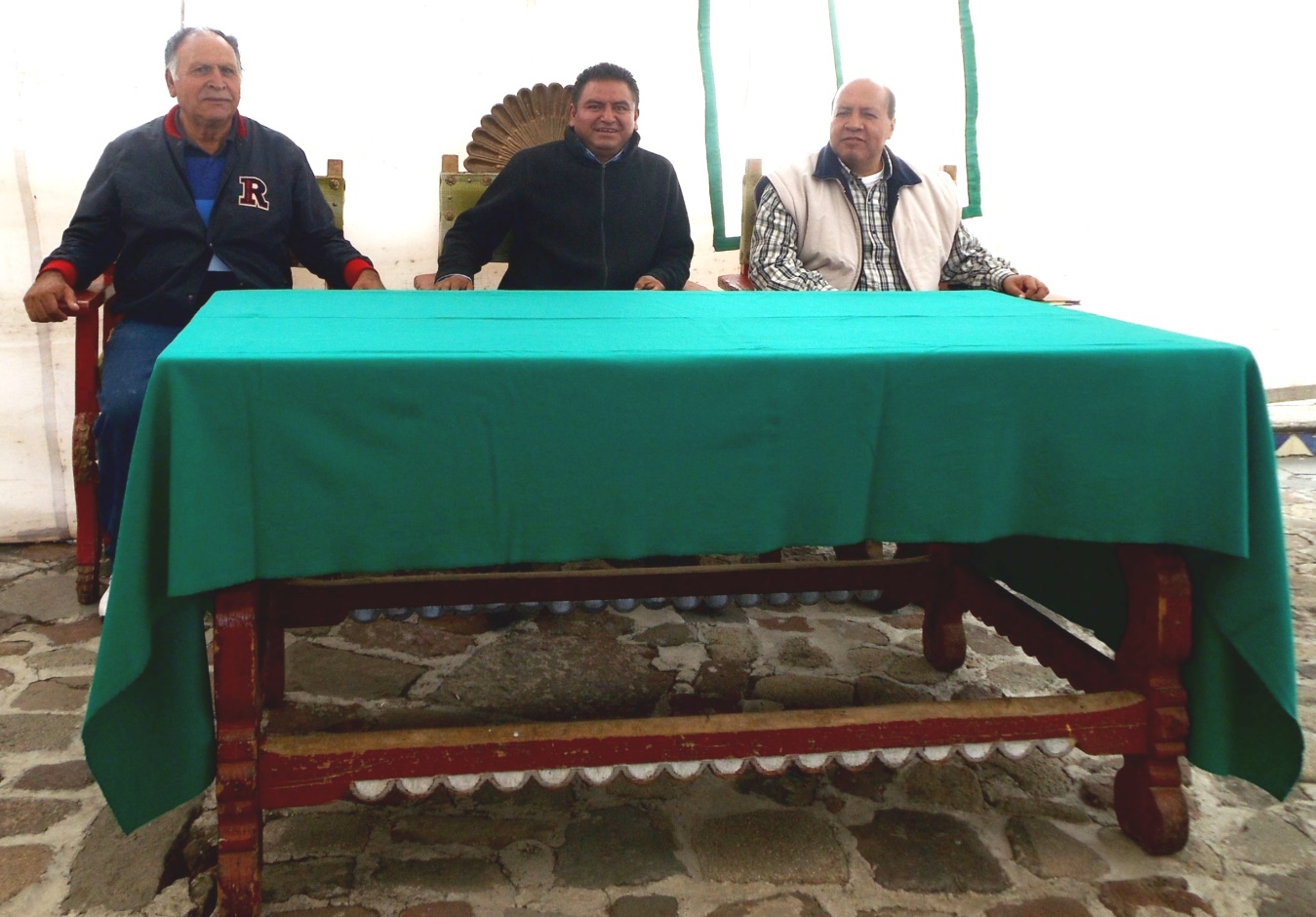 Los fiscales en el año 2013, de la comunidad de Santa María Atlihuetzia, Tlaxcala. Al centro Eleazar Junco Xolocotzi, fiscal, a la izquierda Isidro Adolfo Fernando Hernández Vásquez, mayor y a la derecha Carlos Grande Juárez, escribano (Foto: Valeria Ramírez Corona).