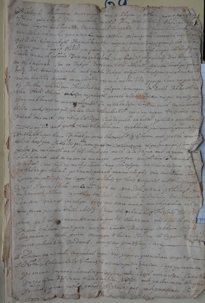 [...] Axcan yc timotequipachohua yn ipanpa tlatepetzin ya techcuiliz nequinochiqui motlaltia yn ipa[n] ycac teopantli auh yn tehua[n] toyoloquimati yn quenin mani tlali auh yn axcan [ilegible] tlali nochitoyolo quimati yn aquique tlaleque ocatca yn axcan mayhu tlali yn nochi nican otocon tecpanque cuix nochioquipia yn itlalamauh yninc otlalcomatoyolopachihui yn axcan mopia yn tlalamatl ynic omoco yn tlalli yn ipan yca S[an]to toribio [...].7